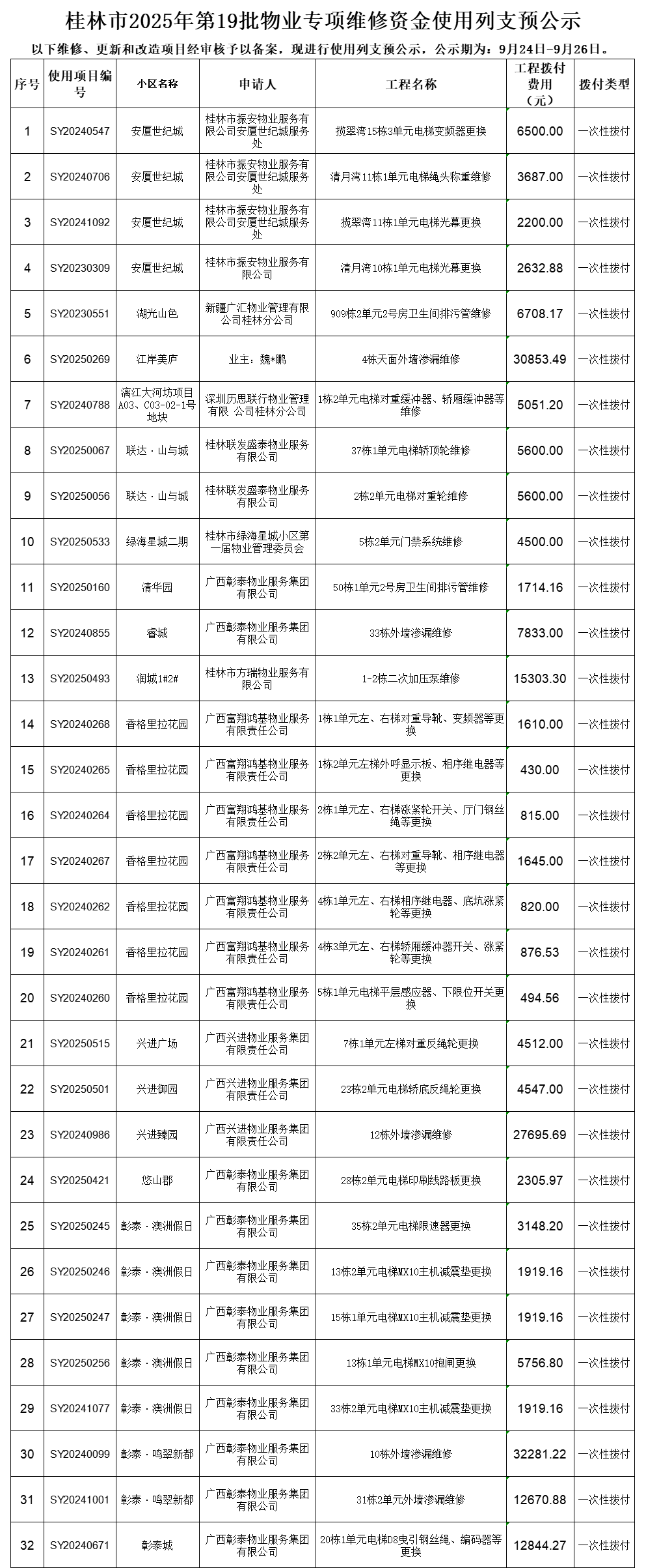桂林市2025年第19批物业专项维修资金使用列支预公示