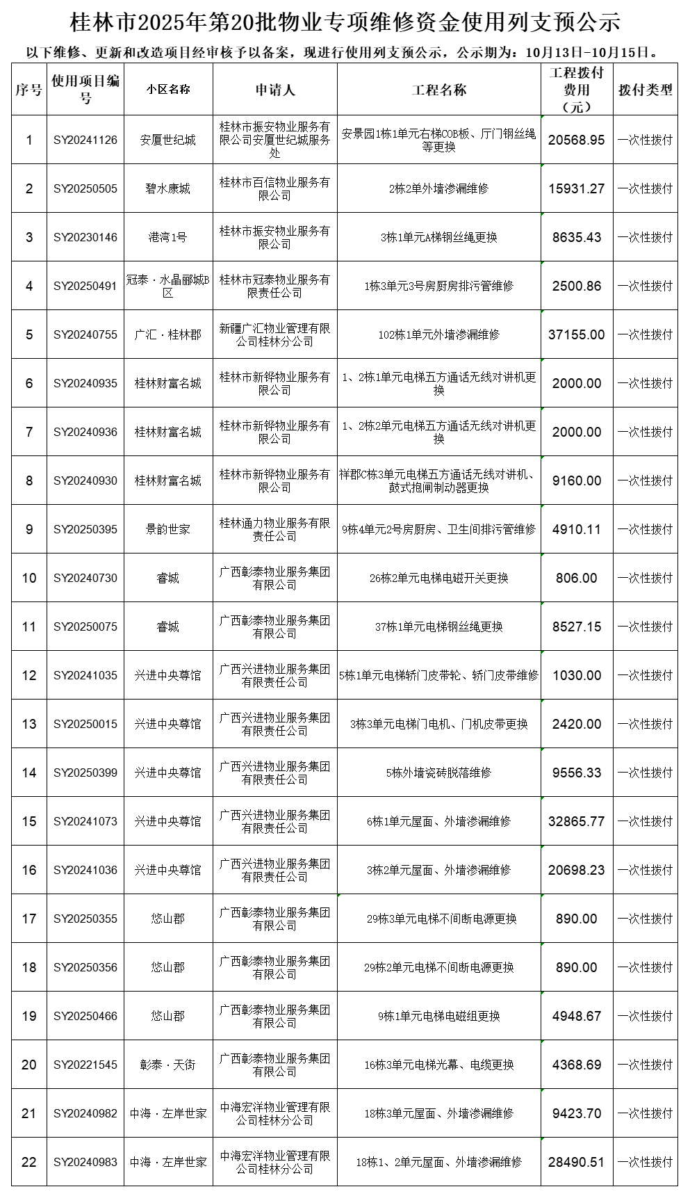 桂林市2025年第20批物业专项维修资金使用列支预公示