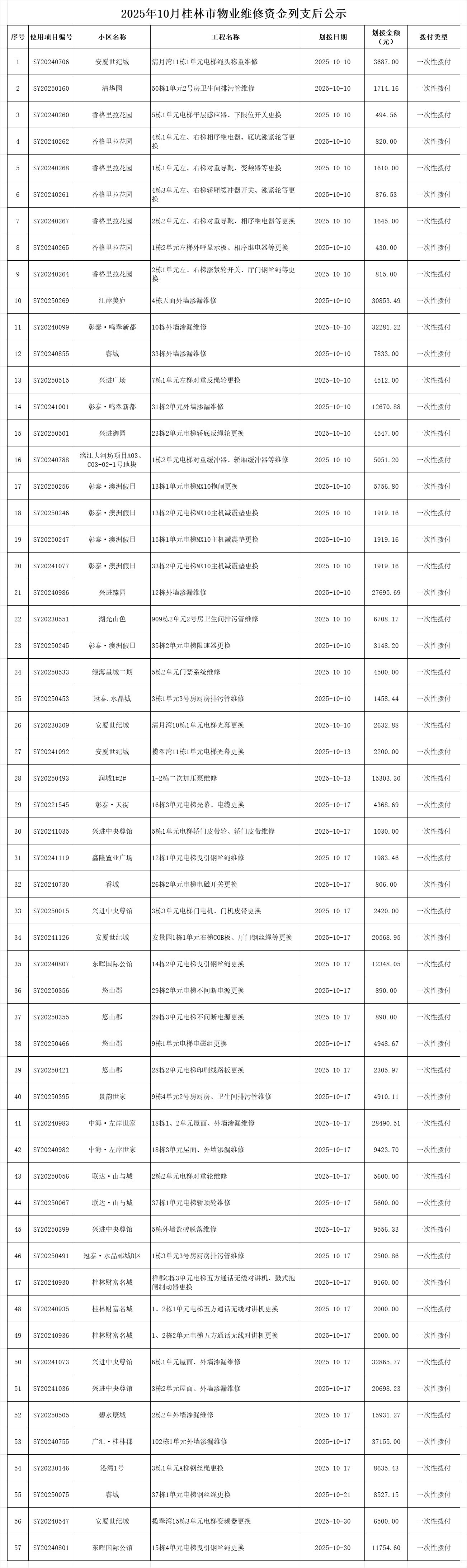 2025年10月桂林市物业维修资金列支后公示