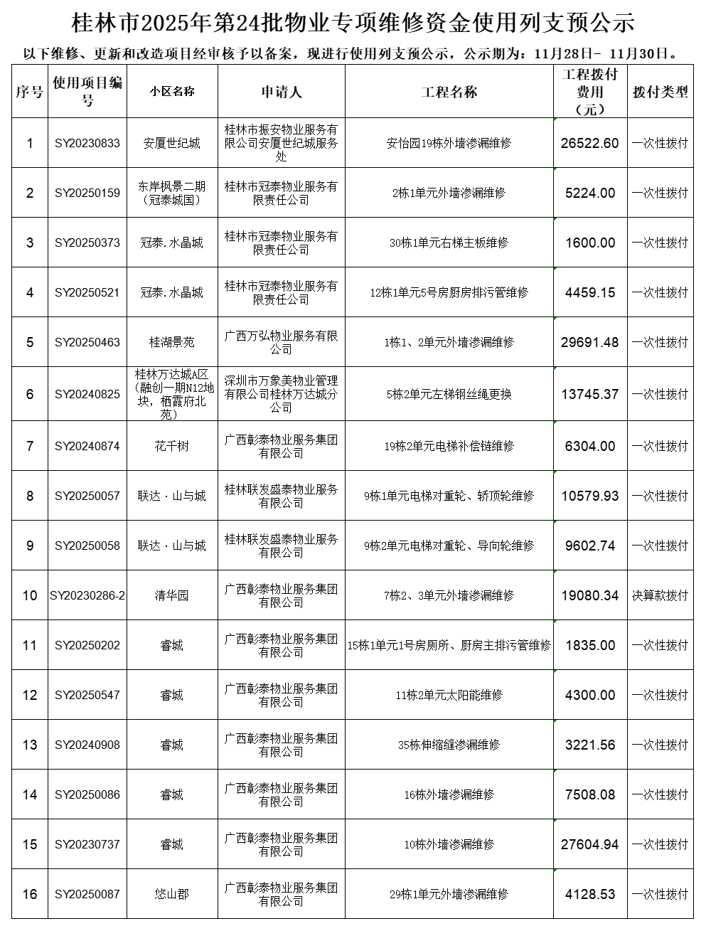 桂林市2025年第24批物业专项维修资金使用列支预公示