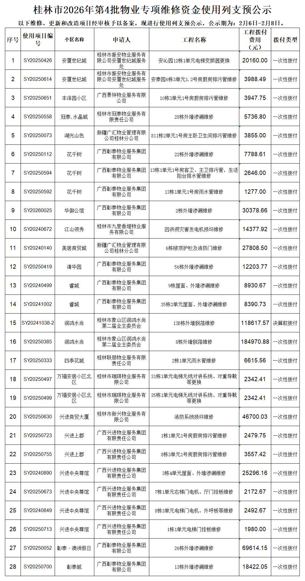 桂林市2026年第4批物业专项维修资金使用列支预公示