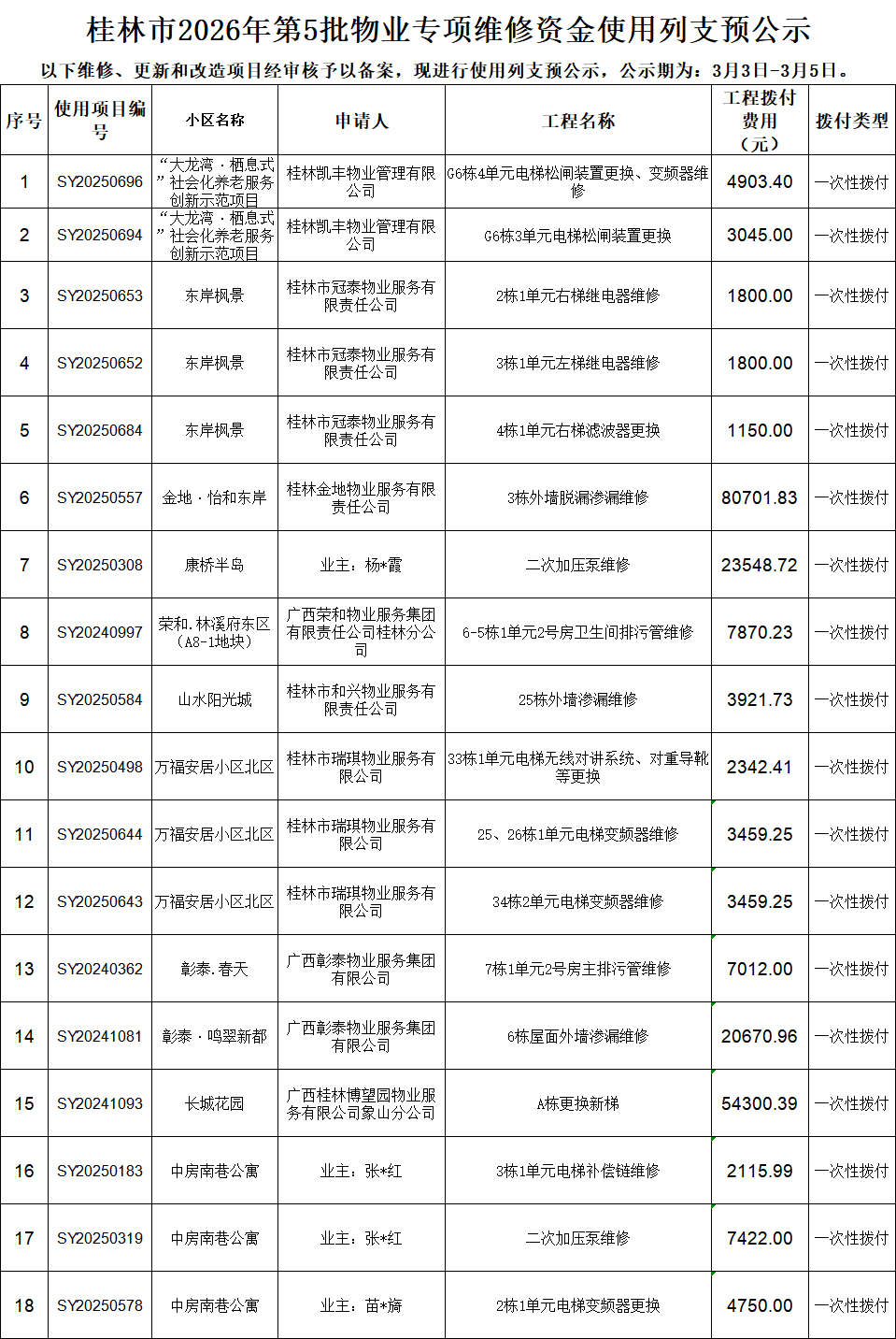 桂林市2026年第5批物业专项维修资金使用列支预公示