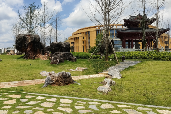 (2)博学静思园:道路与水体高差3.6m,采用台地景观的形式处理场地高差,台阶采用直线条进行逐级分级,硬质台阶采用绿化和坐凳进行软化,使台阶具备观赏性的同时又能满足功能上的需要。