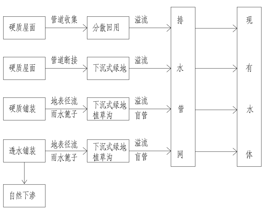 建设区域内开发建设后的年均雨水径流控制率不低于75%,针对本项目,海绵城市的设计思路主要从两个方面进行考虑,一是雨水的调蓄,二是雨水的下渗,结合这两方面,本项目雨水径流在路径如下图所示: