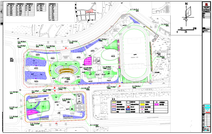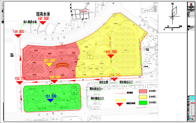 根据场地竖向标高及汇流组织方向,将地块分为3个汇水分区,雨水径流实现分区控制。
