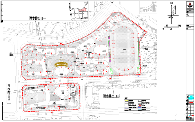 据对本项目的竖向进行的分析。以及市政道路下排水管网的走向,场地内雨水通过分散的雨水口和雨水管道收集后排至三个雨水排放口。