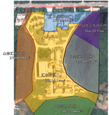 根据本次改造内容、场地竖向、设施功能及现状雨水管道接驳条件划分两个汇水分区,汇水分区一雨水径流最终排至市政雨水管网,汇水分区二雨水径流最终场地外现状沟渠。场地外三面山体共分为四个汇水分区。各汇水分区内分布海绵措施,具体划分区域及下垫面指标如下: