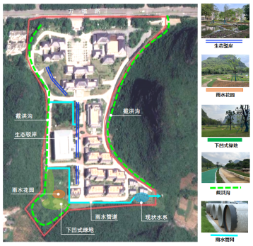 本次改造建设内容主要包括:党校三面山脚下截洪沟建设,总长约1579m;新建雨水管网约730m;现状水系沿线景观提升,包括种植水生植被、增设生态驳岸;增大现状水系的蓄水面积约595㎡;增设雨水花园2167.19m²、下凹式绿地6411.77m²,具体方案如下。