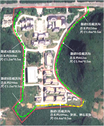 (1)校区内三面山体周围设置截洪沟,拦截山体排水,截洪沟依地势找坡最终汇至党校东南角现状排水沟,通过对现状排水沟疏挖,增加排水能力,解决整个校区的内涝积水问题;