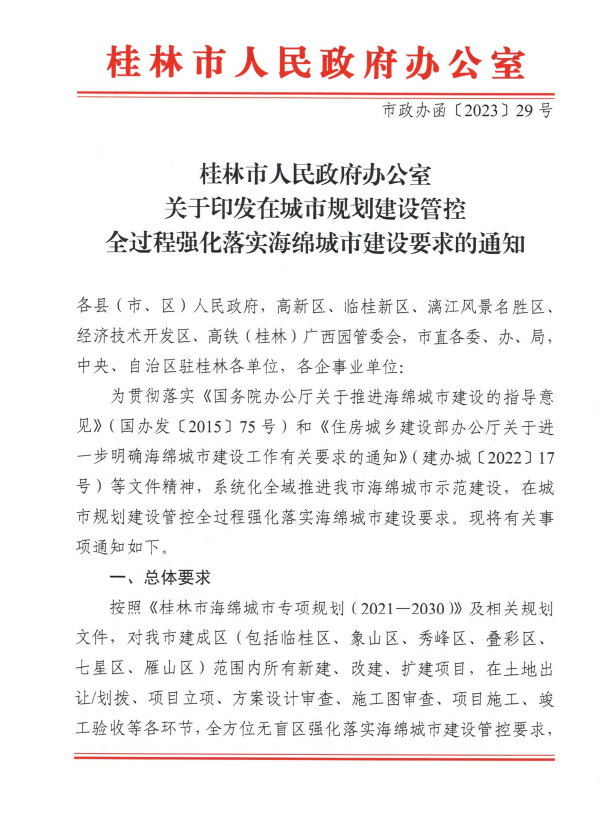 桂林市人民政府办公室关于印发在城市规划建设管控全过程强化落实海绵城市建设要求的通知(市政办函[2023]29号)