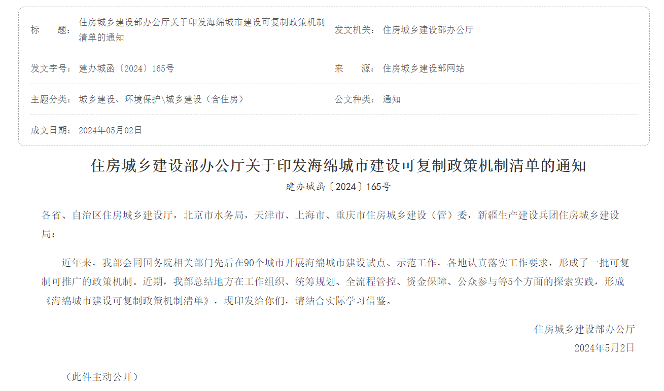 住房城乡建设部办公厅关于印发海绵城市建设可复制政策机制清单的通知