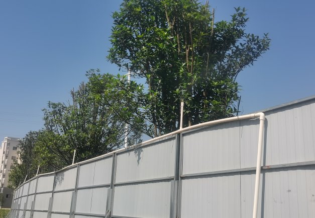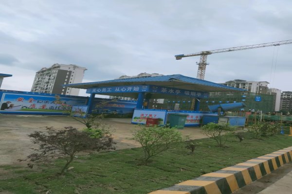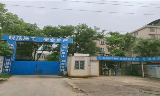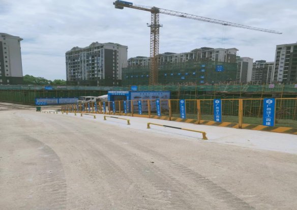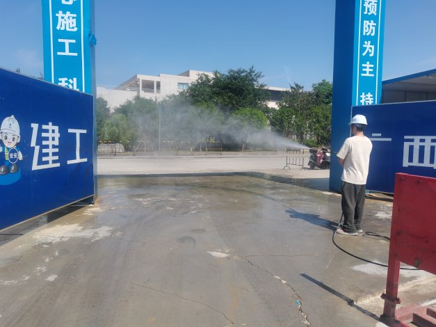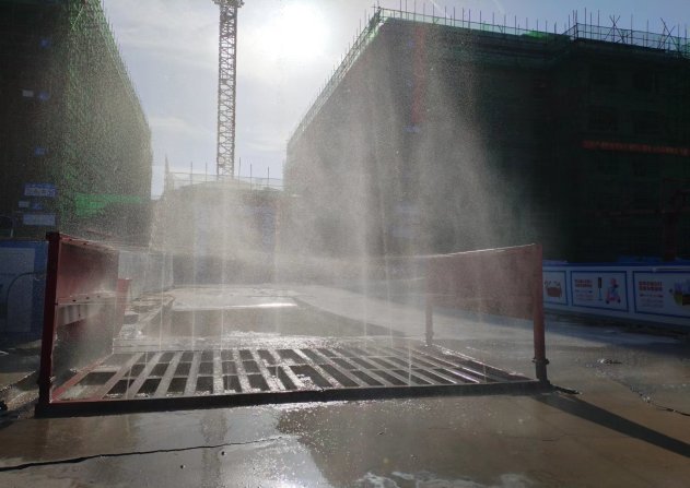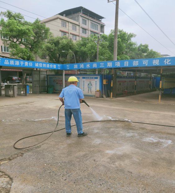 工地大门路面干净整洁,围墙围挡喷淋系统、洗车槽-高压洗车装置等设施运转正常,车辆出入有专人清洗。
